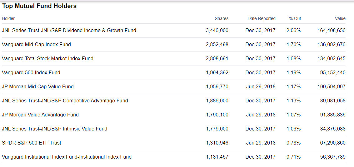 The third list will give you a list of the mutual funds that own the most stock in the company. You will notice that a large investment manager such as Vanguard or JP Morgan will have several different funds that own shares in the company. This information can be valuable if you’re an investor, but for our purposes it’s generally more useful to look at the list of largest institutional shareholders, above.