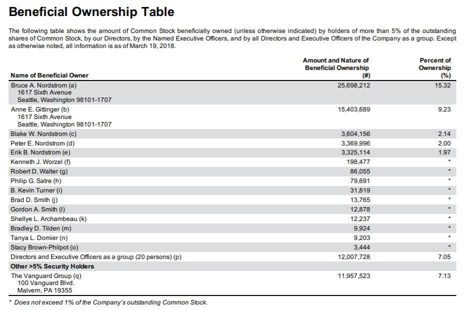 Once you’ve downloaded the company’s proxy statement, locate the section called Security Ownership of Certain Beneficial Owners and Management. This is where you’ll find the list of corporate insiders and how much stock they have, as well as information on any other shareholders that own five percent or more of the company. You’ll notice that at Nordstrom, members of the family who founded the company still own a large percentage of the shares.