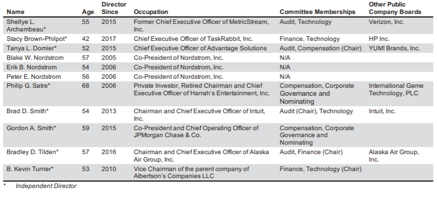 Look for any overlap between the institutions that own the most stock in the company and the members of the board. In Nordstrom’s case, you can see that the Co-President and CEO of J.P. Morgan sits on the board. You know from the list above that J.P. Morgan owns 3.38 percent of the shares in the company. This suggests J.P. Morgan is probably an important voice in the corporate boardroom.